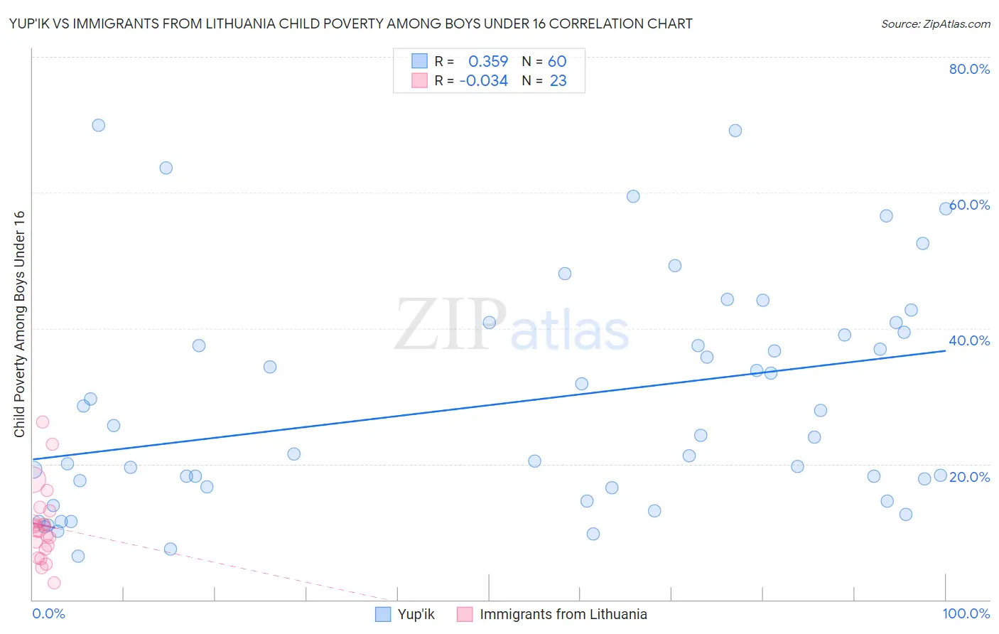Yup'ik vs Immigrants from Lithuania Child Poverty Among Boys Under 16 Correlation Chart