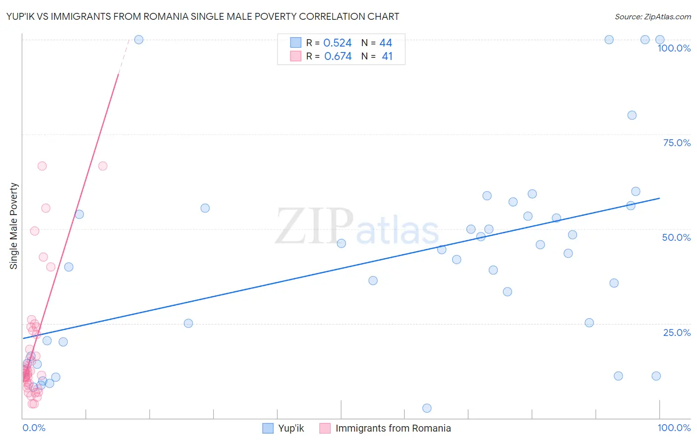 Yup'ik vs Immigrants from Romania Single Male Poverty Correlation Chart