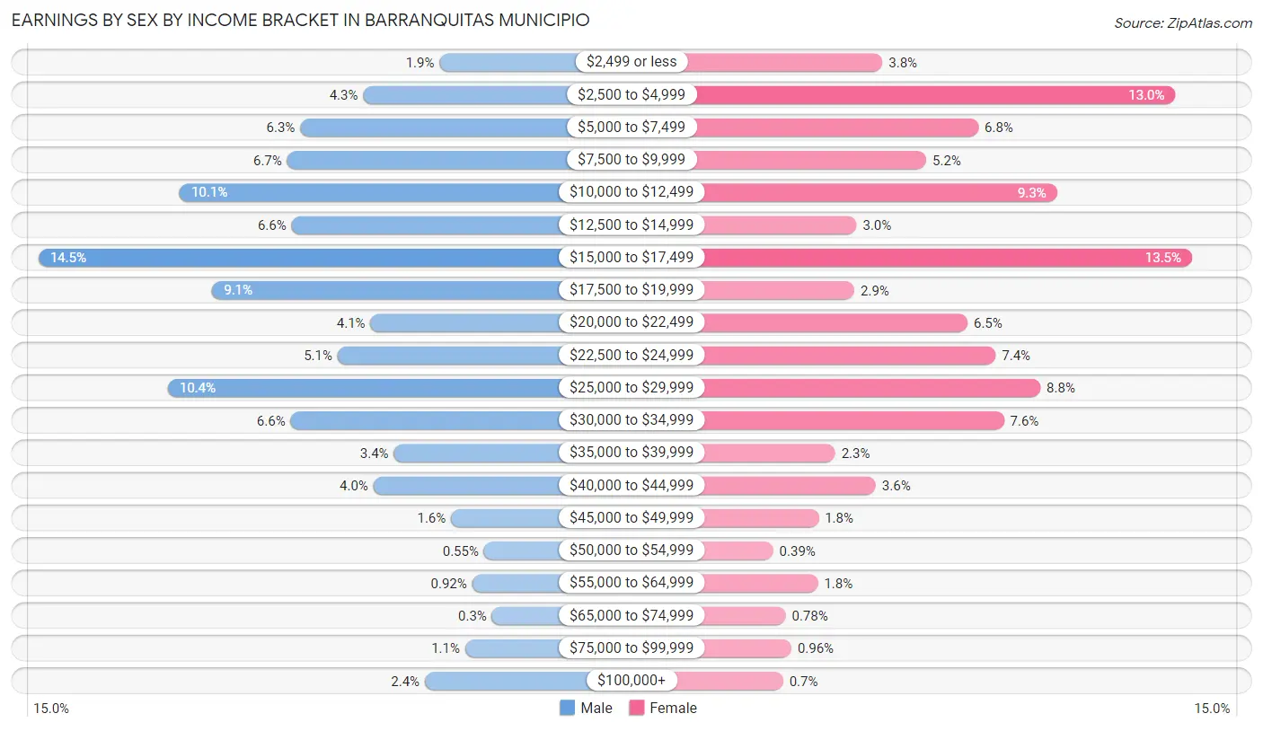 The most common earnings brackets in Barranquitas Municipio are $15,000 to $17,499 for men (816 | 14.5%) and $15,000 to $17,499 for women (521 | 13.5%).