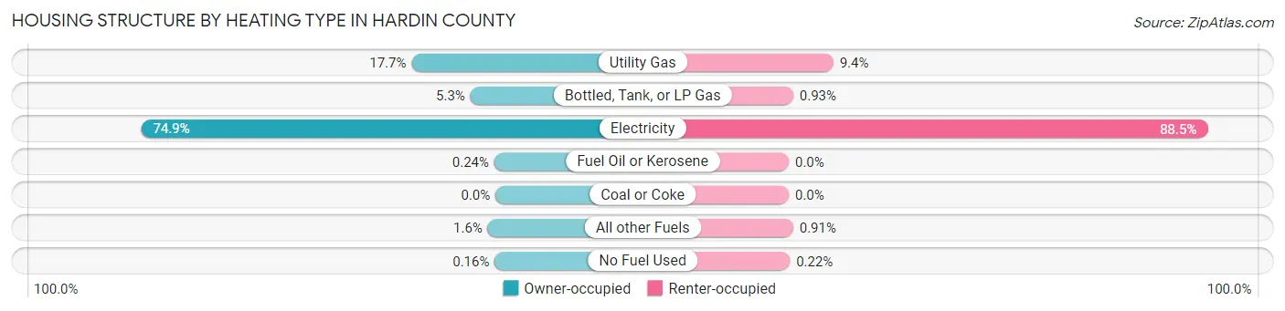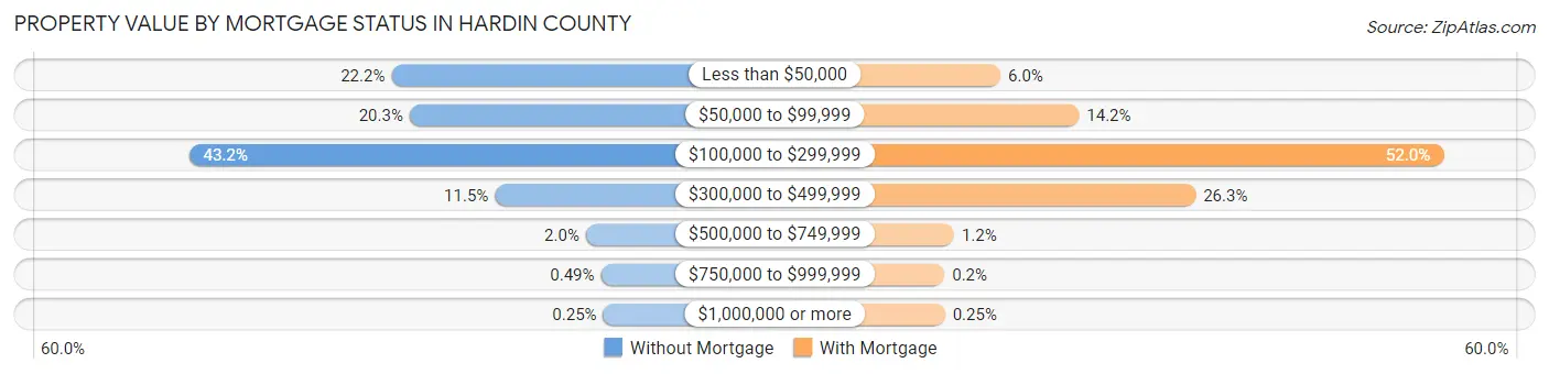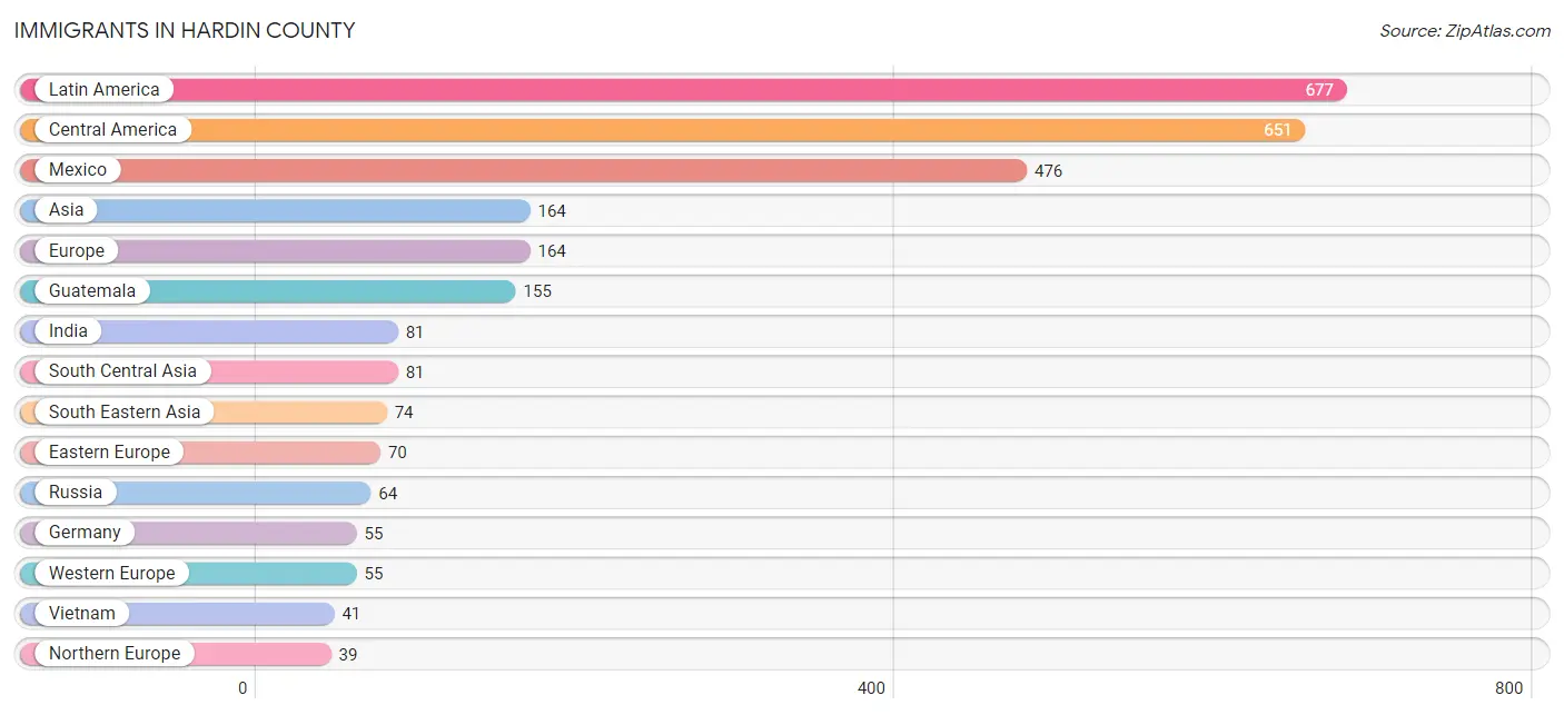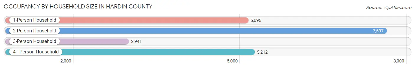 As of the 2010 census, Hardin County had a population of 54,635. The population is largely white (77.3%), with African Americans (17.2%) and Hispanics (4.5%) making up the remainder of the population. The median household income in the county is $45,845, and the median home value is $117,400.