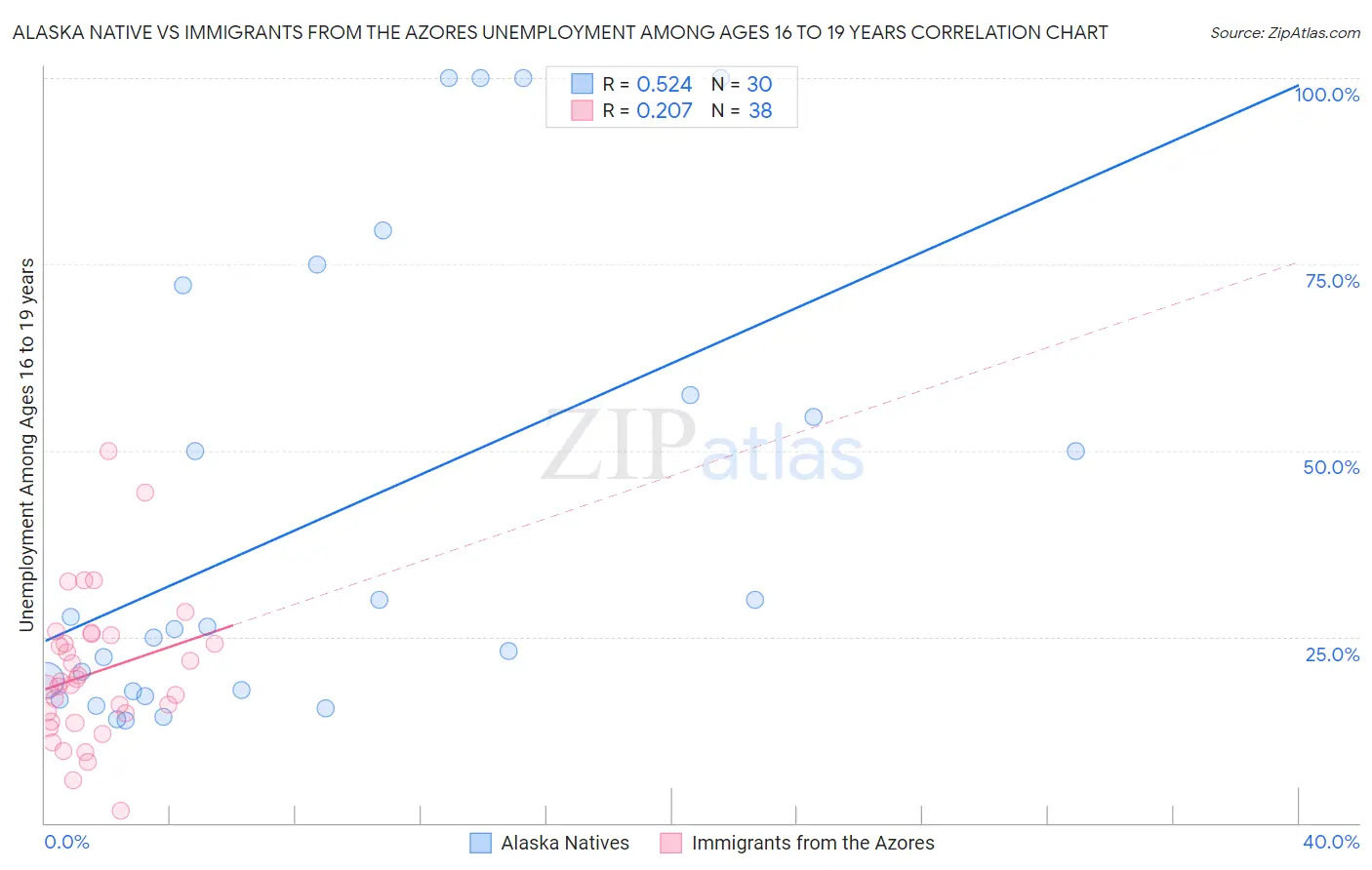 Alaska Native vs Immigrants from the Azores Unemployment Among Ages 16 to 19 years Correlation Chart