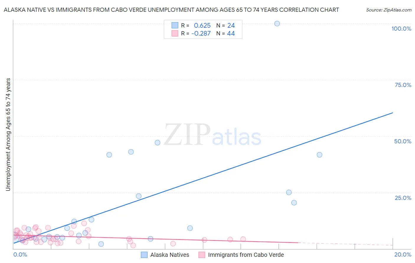 Alaska Native vs Immigrants from Cabo Verde Unemployment Among Ages 65 to 74 years Correlation Chart