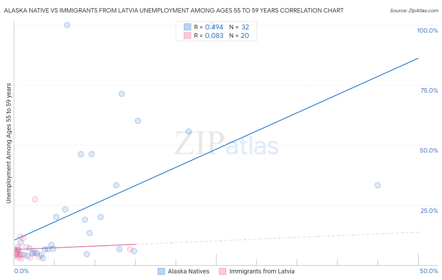 Alaska Native vs Immigrants from Latvia Unemployment Among Ages 55 to 59 years Correlation Chart