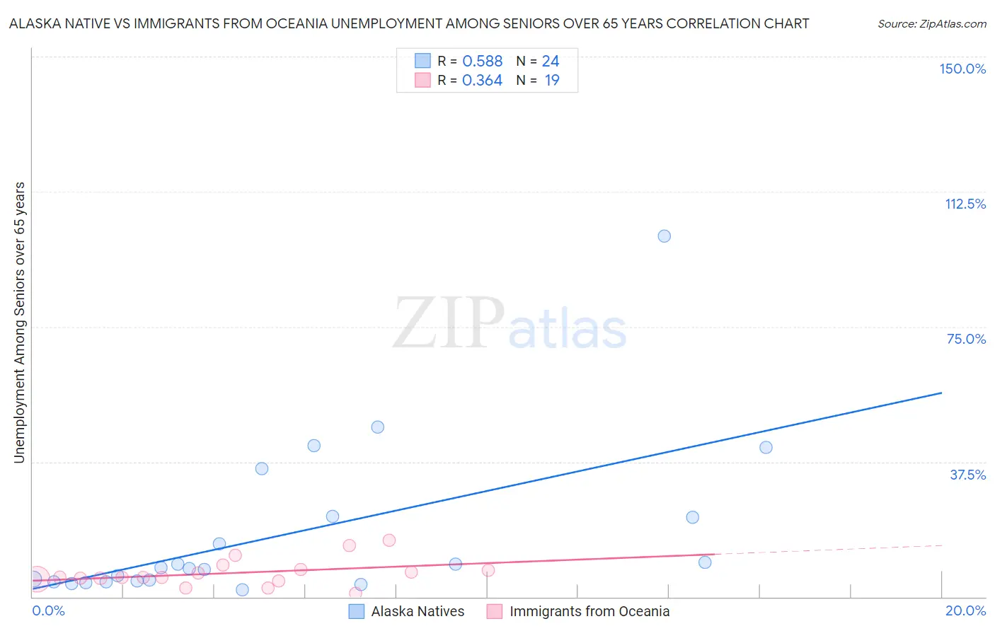 Alaska Native vs Immigrants from Oceania Unemployment Among Seniors over 65 years Correlation Chart