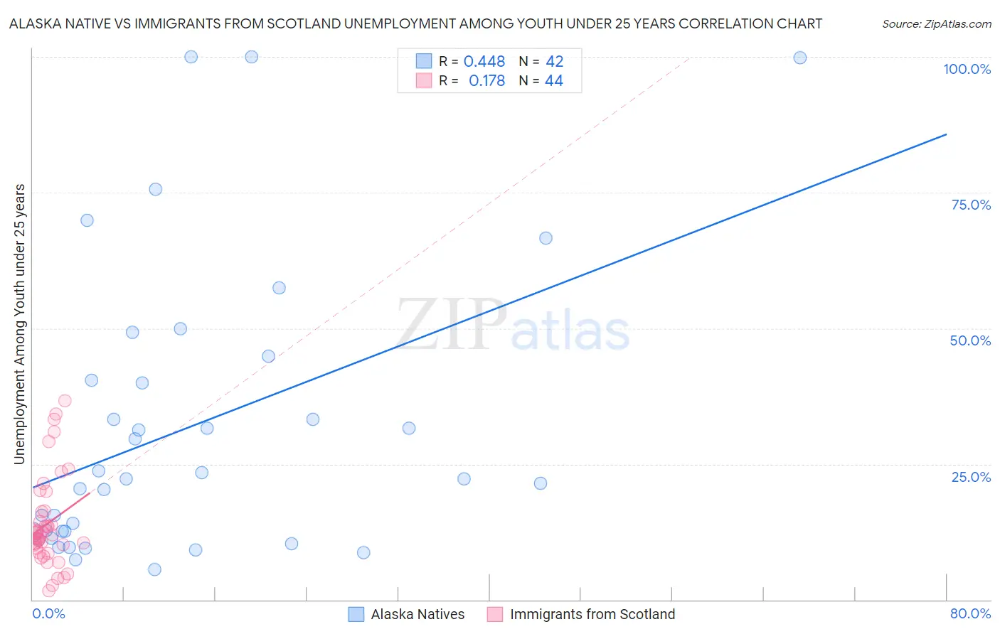 Alaska Native vs Immigrants from Scotland Unemployment Among Youth under 25 years Correlation Chart