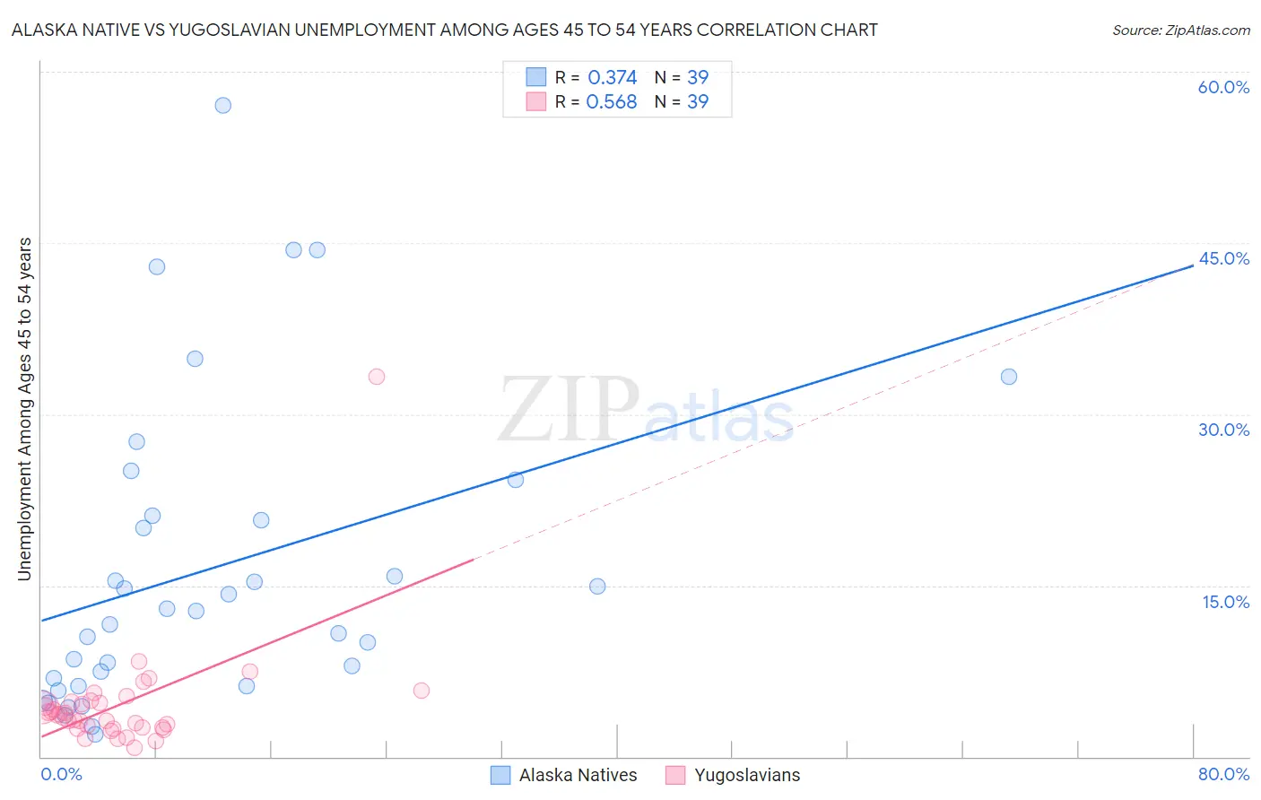 Alaska Native vs Yugoslavian Unemployment Among Ages 45 to 54 years Correlation Chart
