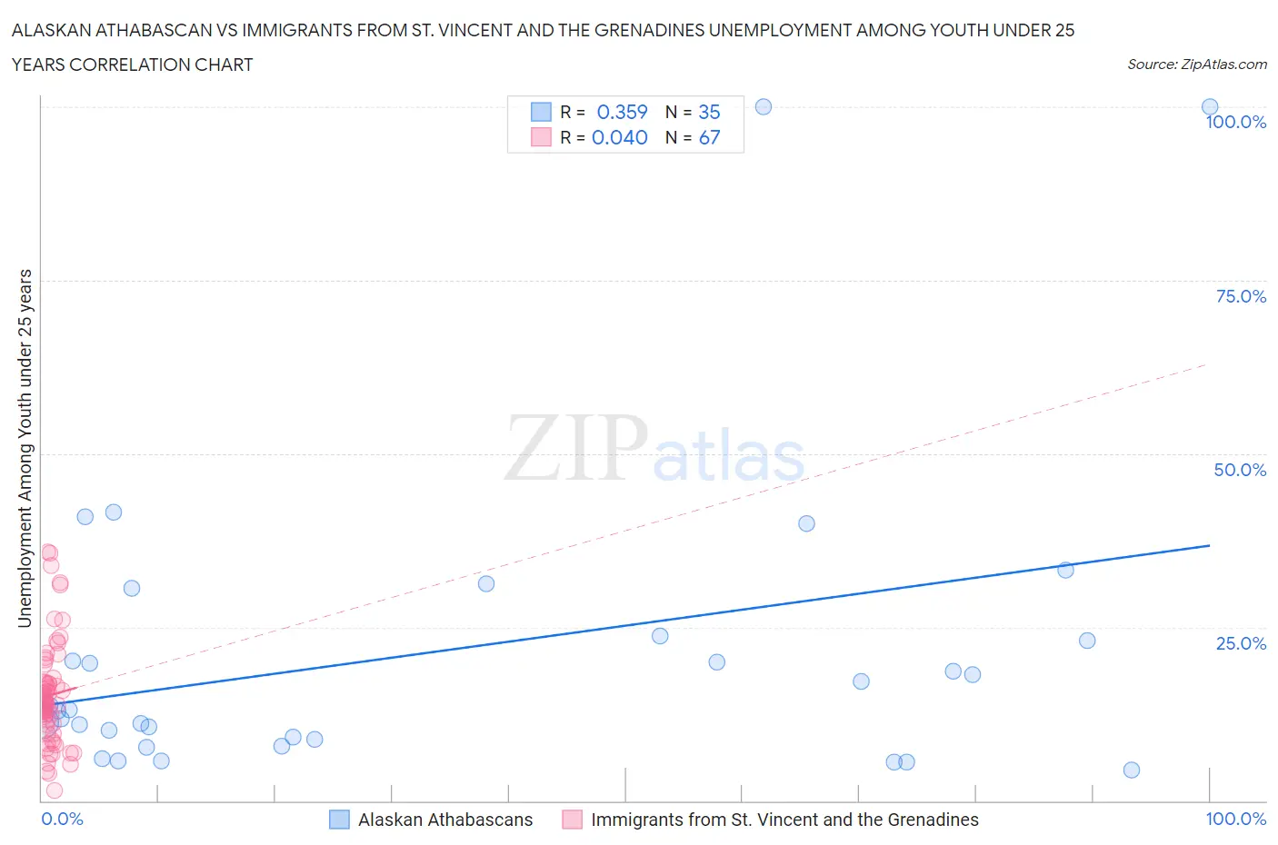 Alaskan Athabascan vs Immigrants from St. Vincent and the Grenadines Unemployment Among Youth under 25 years Correlation Chart