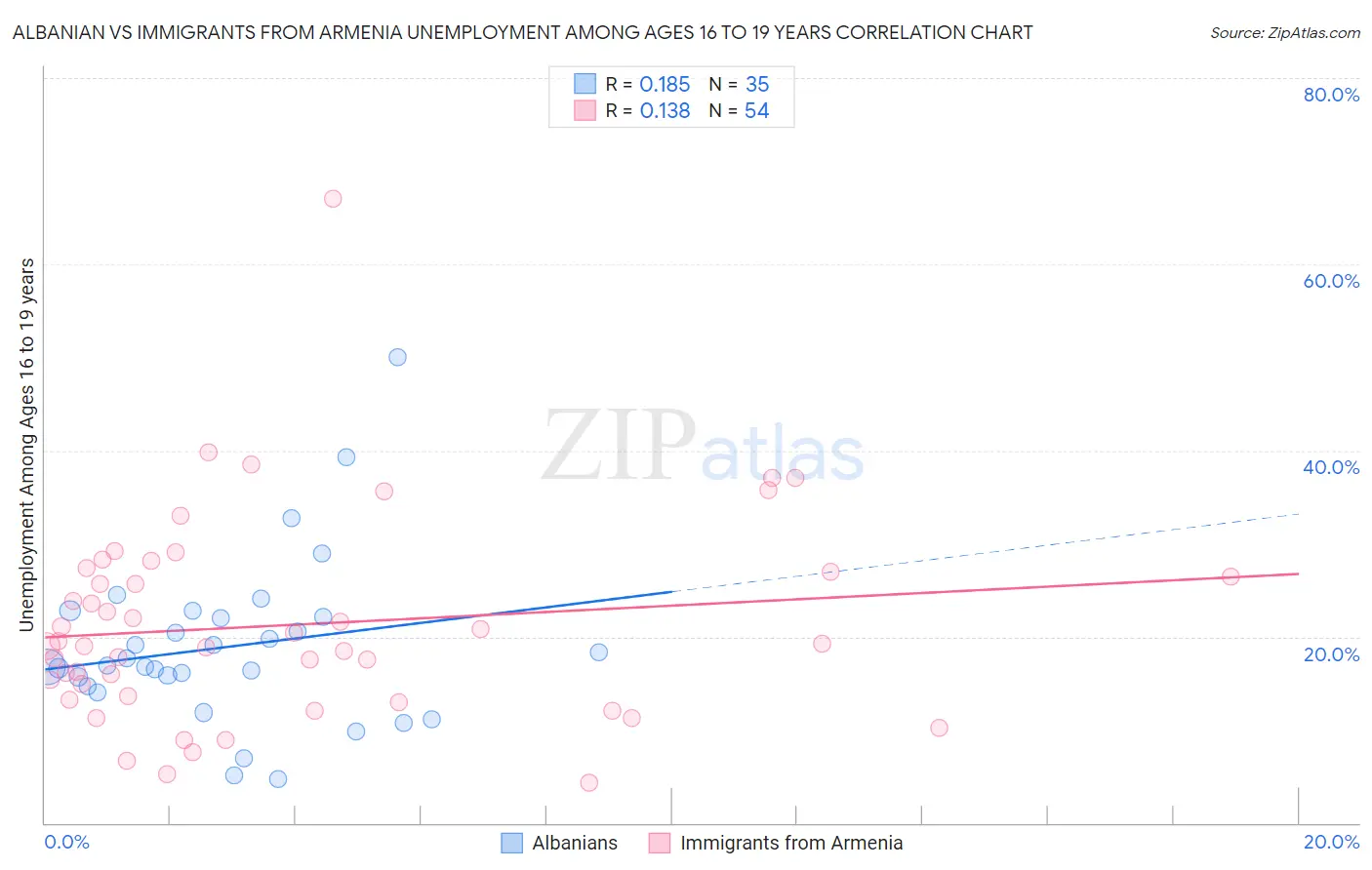Albanian vs Immigrants from Armenia Unemployment Among Ages 16 to 19 years