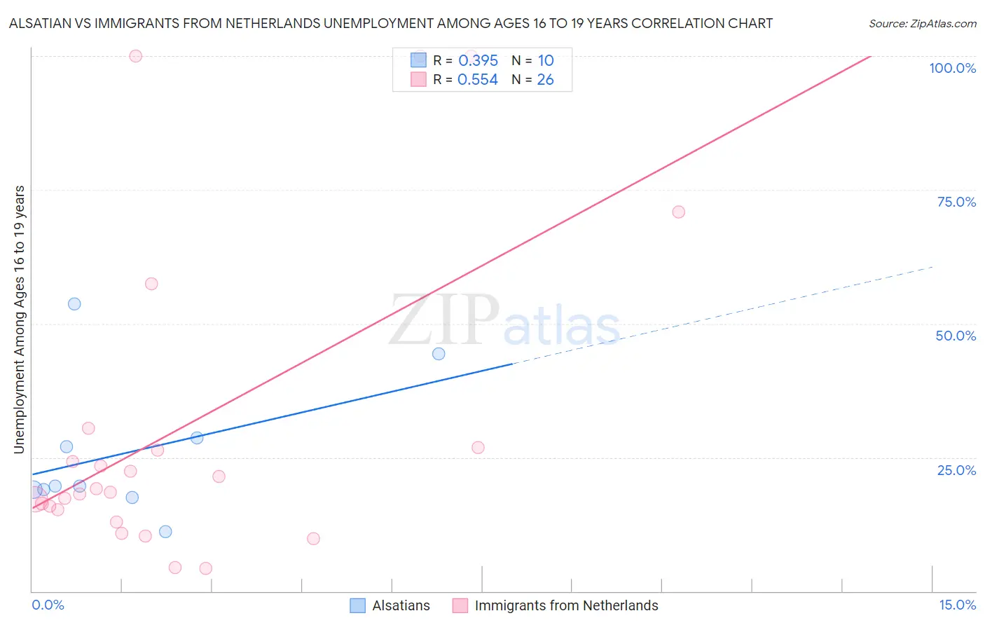 Alsatian vs Immigrants from Netherlands Unemployment Among Ages 16 to 19 years Correlation Chart