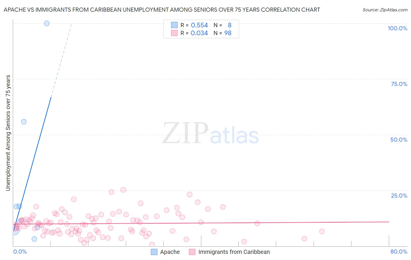 Apache vs Immigrants from Caribbean Unemployment Among Seniors over 75 years Correlation Chart