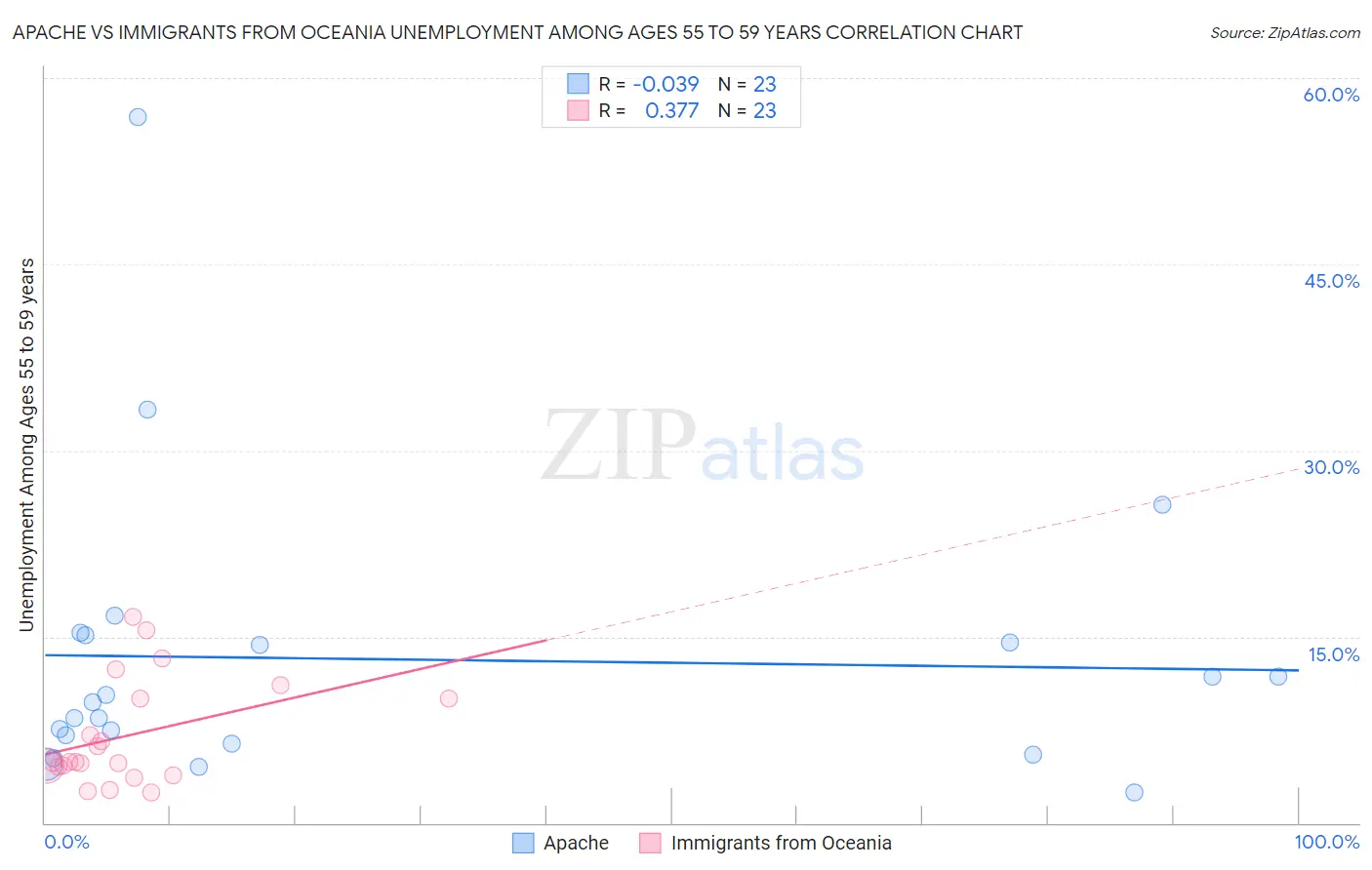 Apache vs Immigrants from Oceania Unemployment Among Ages 55 to 59 years