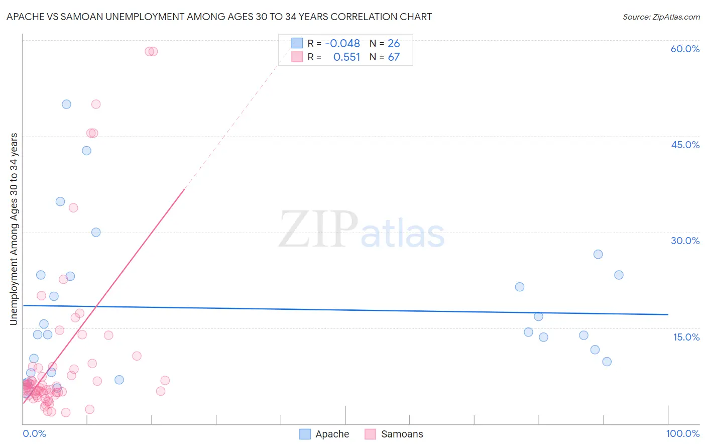 The statistical analysis conducted on geographies consisting of 223,147,078 people shows no correlation between the proportion of Apache and unemployment rate among population between the ages 30 and 34 in the United States with a correlation coefficient (R) of -0.048 and weighted average of 7.3%. Similarly, the statistical analysis conducted on geographies consisting of 218,774,829 people shows a substantial positive correlation between the proportion of Samoans and unemployment rate among population between the ages 30 and 34 in the United States with a correlation coefficient (R) of 0.551 and weighted average of 5.8%, a difference of 26.3%.