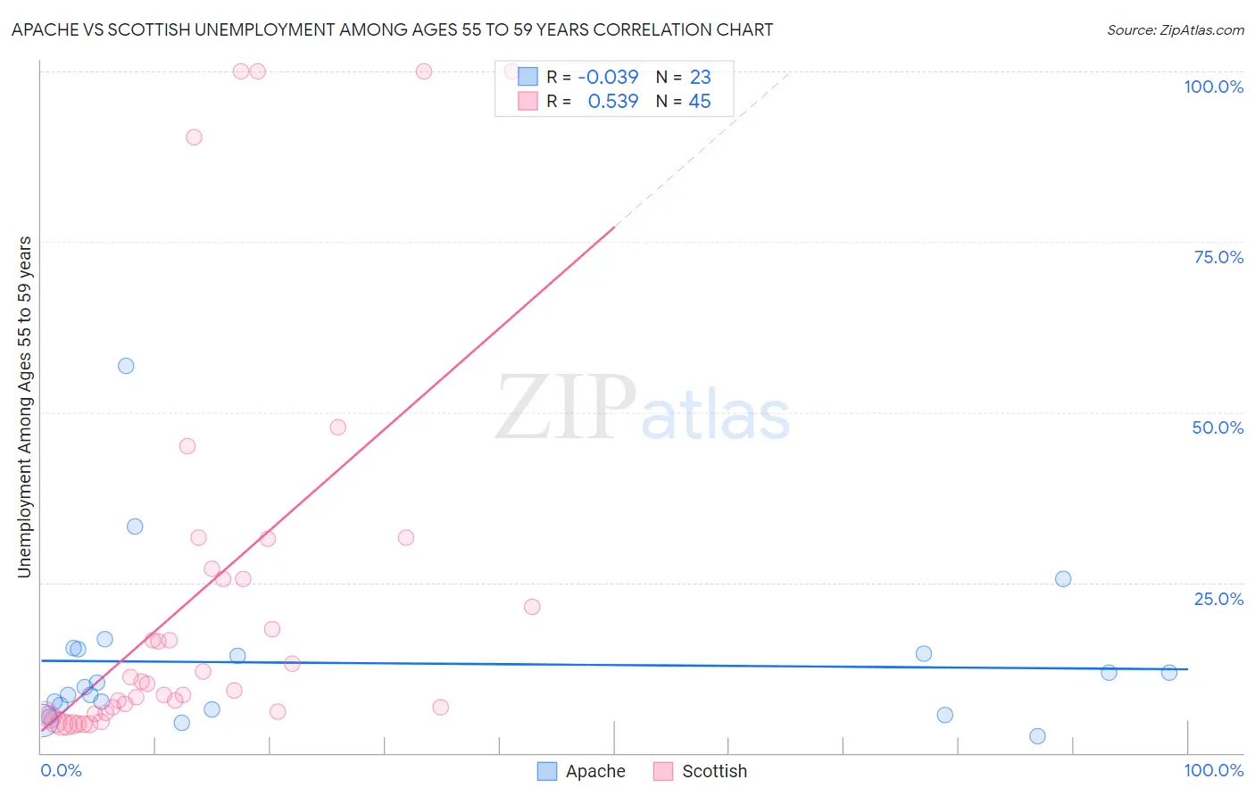 The statistical analysis conducted on geographies consisting of 219,300,222 people shows no correlation between the proportion of Apache and unemployment rate among population between the ages 55 and 59 in the United States with a correlation coefficient (R) of -0.039 and weighted average of 5.3%. Similarly, the statistical analysis conducted on geographies consisting of 482,661,898 people shows a substantial positive correlation between the proportion of Scottish and unemployment rate among population between the ages 55 and 59 in the United States with a correlation coefficient (R) of 0.539 and weighted average of 4.5%, a difference of 16.3%.