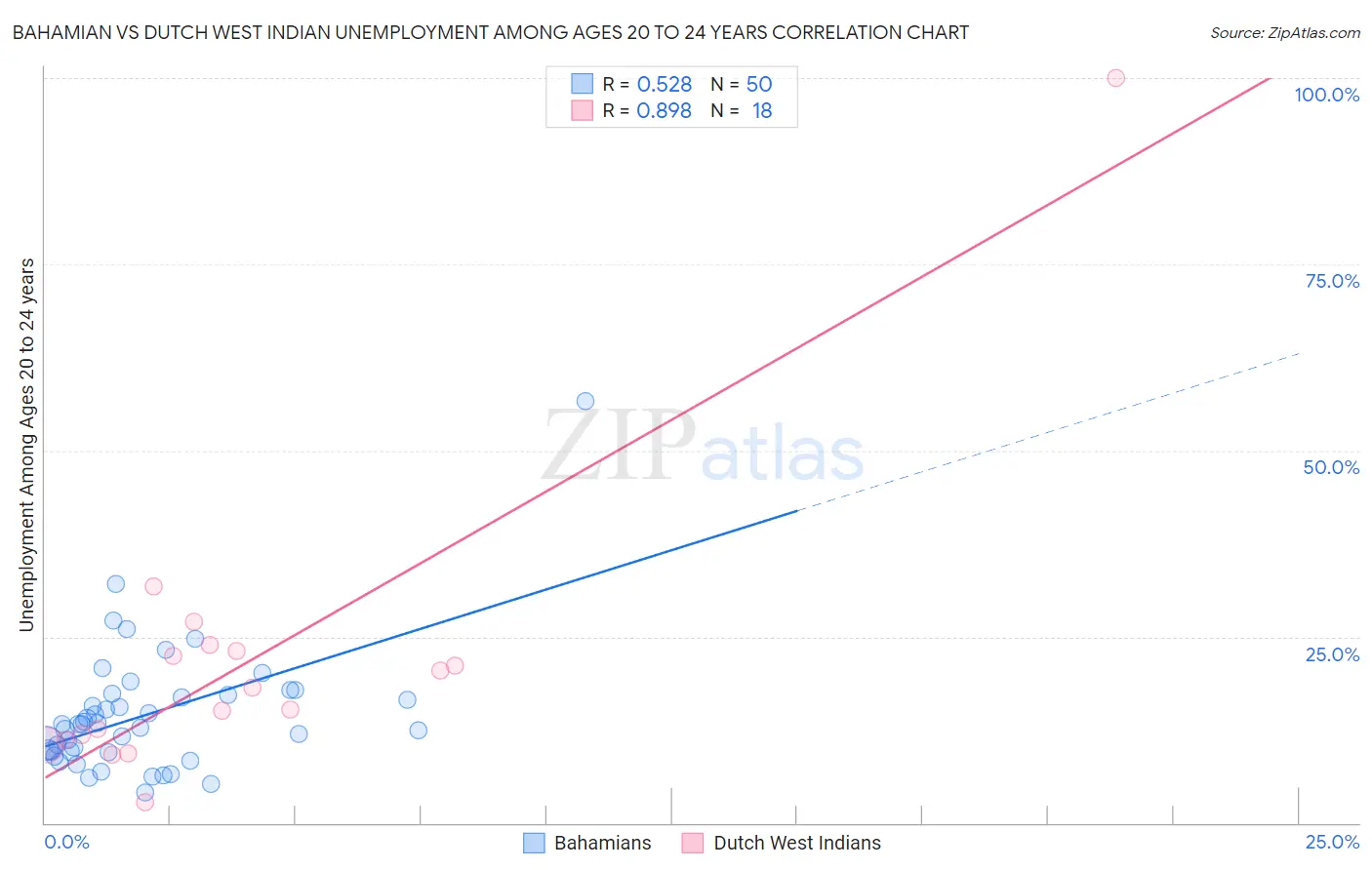 Bahamian vs Dutch West Indian Unemployment Among Ages 20 to 24 years Correlation Chart
