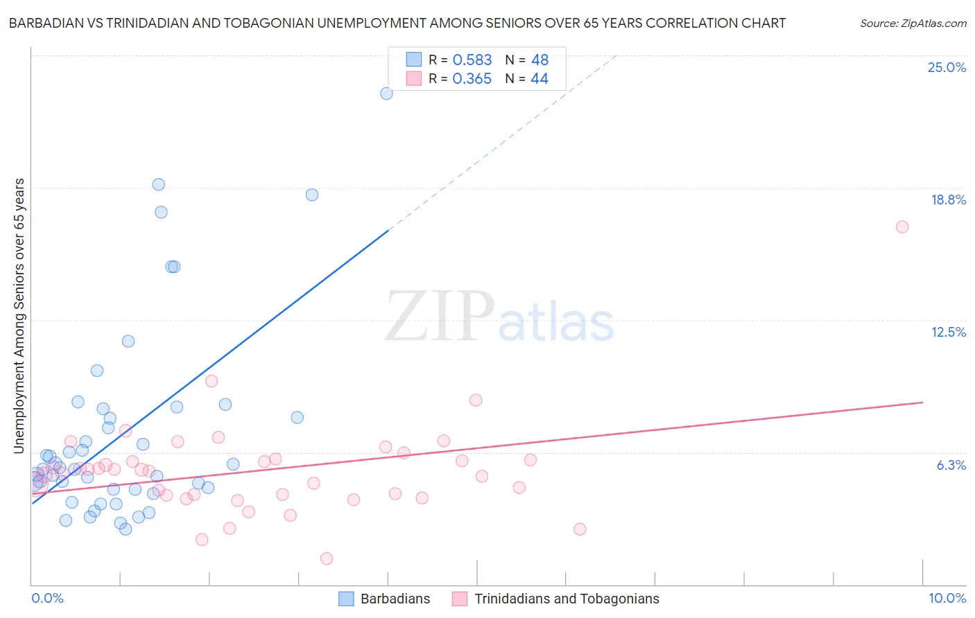Barbadian vs Trinidadian and Tobagonian Unemployment Among Seniors over 65 years Correlation Chart