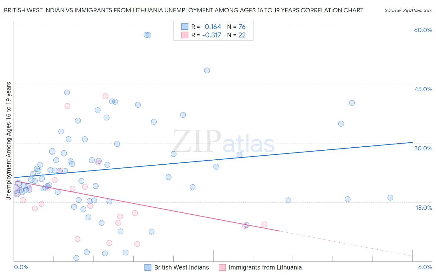 British West Indian vs Immigrants from Lithuania Unemployment Among Ages 16 to 19 years Correlation Chart