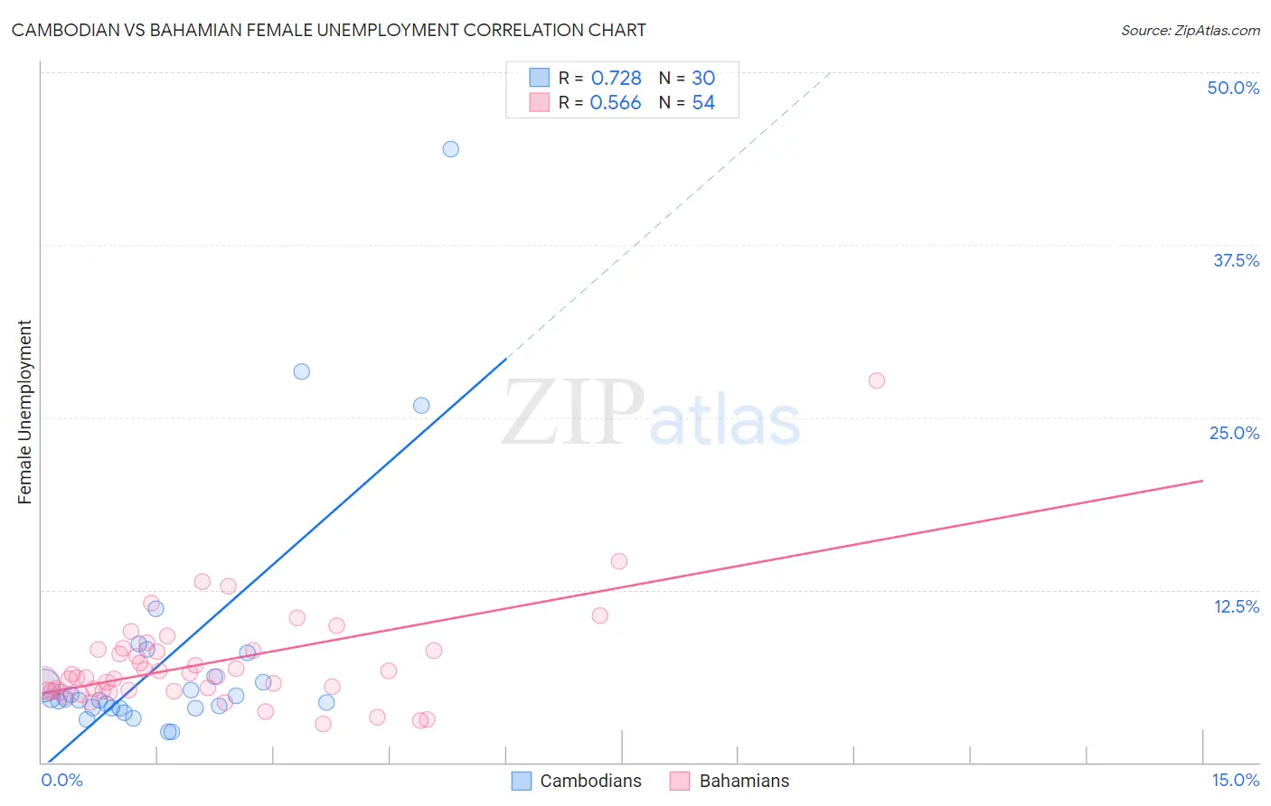 Cambodian vs Bahamian Female Unemployment Correlation Chart