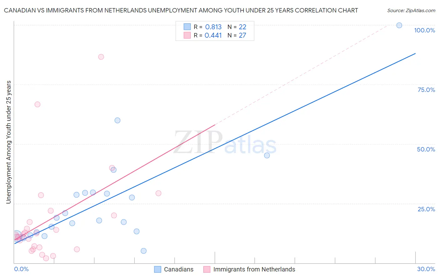 Canadian vs Immigrants from Netherlands Unemployment Among Youth under 25 years Correlation Chart