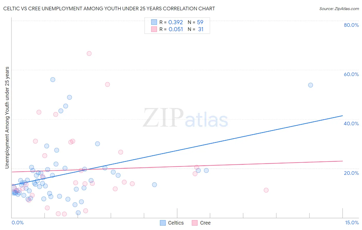 The statistical analysis conducted on geographies consisting of 167,560,054 people shows a mild positive correlation between the proportion of Celtics and unemployment rate among youth under the age of 25 in the United States with a correlation coefficient (R) of 0.392 and weighted average of 11.3%. Similarly, the statistical analysis conducted on geographies consisting of 75,921,108 people shows a slight positive correlation between the proportion of Cree and unemployment rate among youth under the age of 25 in the United States with a correlation coefficient (R) of 0.051 and weighted average of 12.4%, a difference of 10.3%.