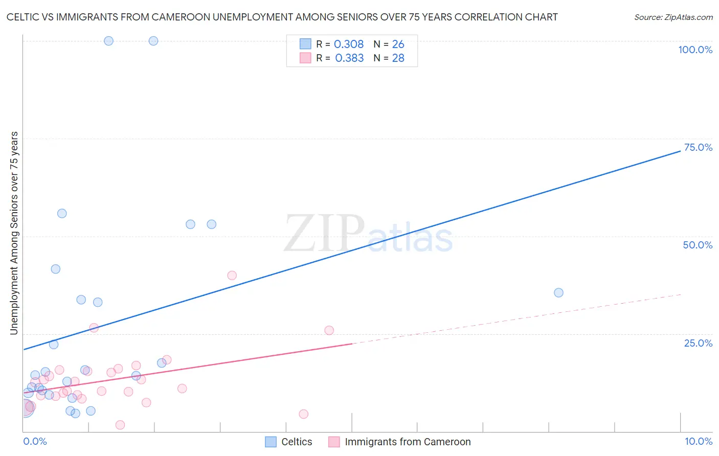 Celtic vs Immigrants from Cameroon Unemployment Among Seniors over 75 years Correlation Chart