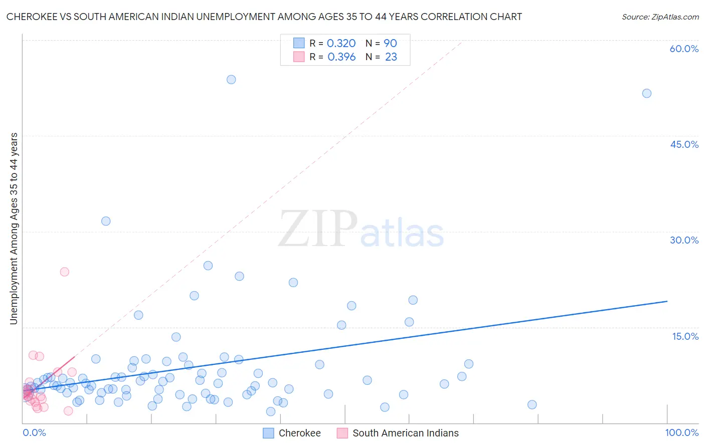 Cherokee vs South American Indian Unemployment Among Ages 35 to 44 years Correlation Chart