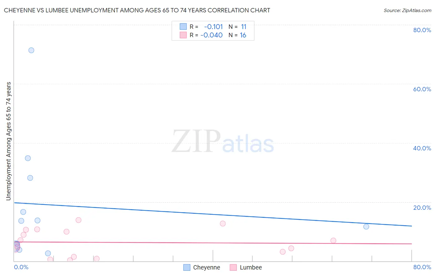Cheyenne vs Lumbee Unemployment Among Ages 65 to 74 years