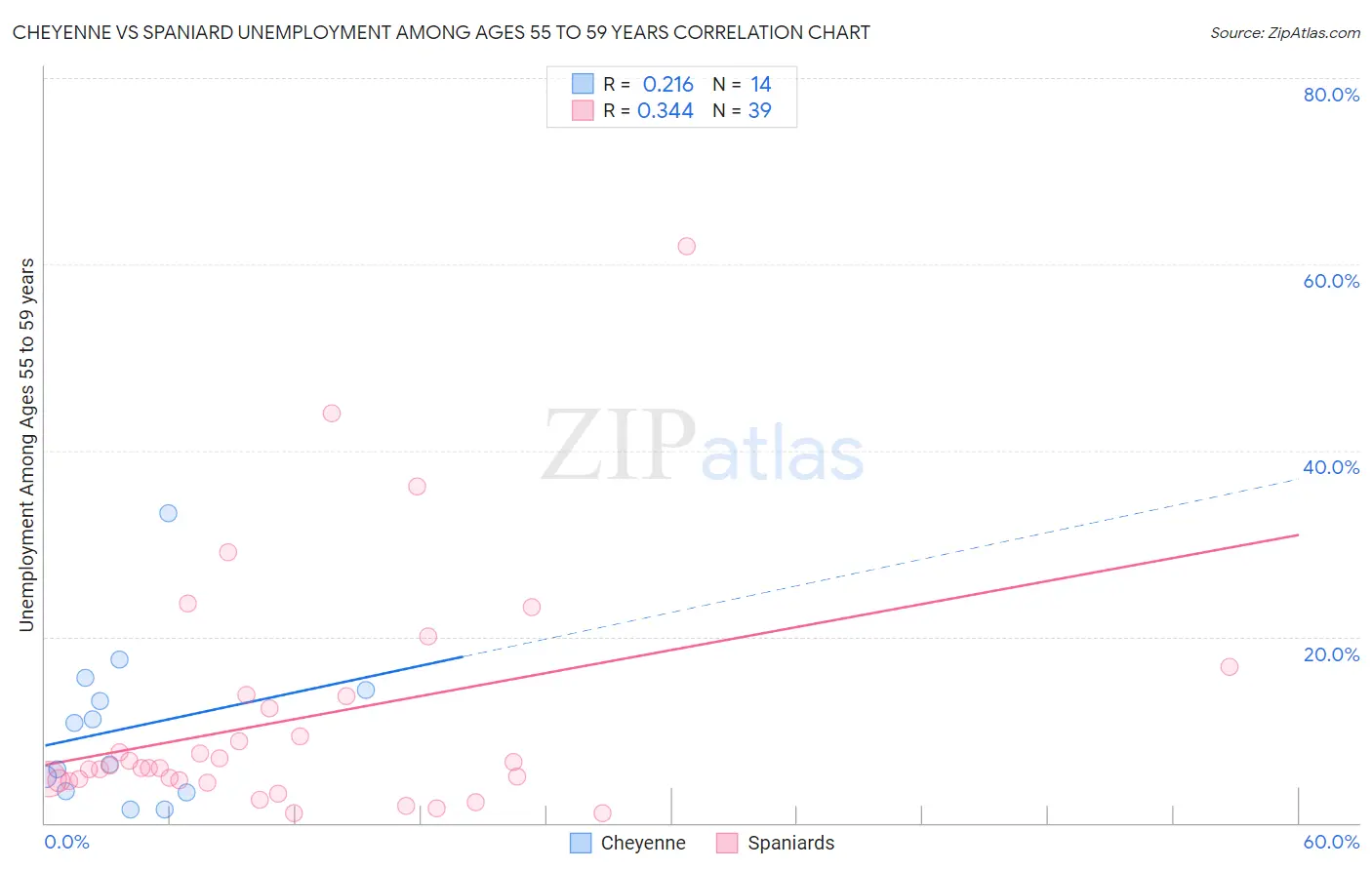Cheyenne vs Spaniard Unemployment Among Ages 55 to 59 years Correlation Chart