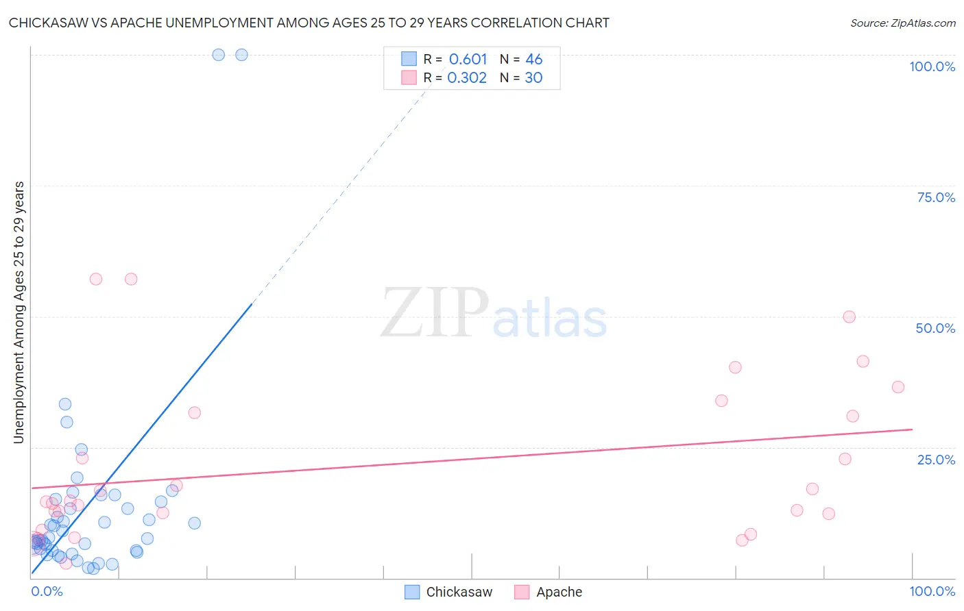 Chickasaw vs Apache Unemployment Among Ages 25 to 29 years Correlation Chart