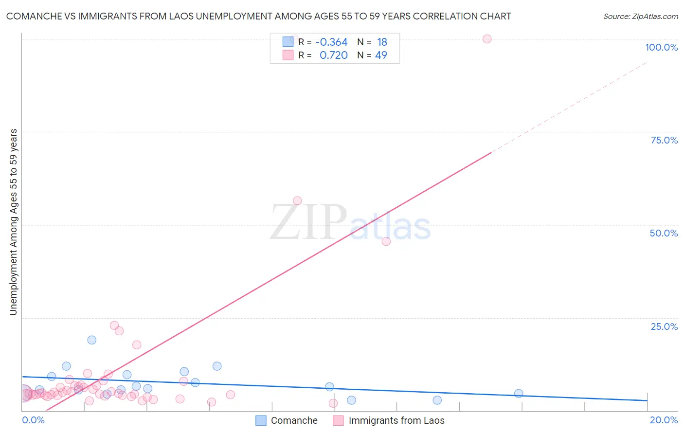 Comanche vs Immigrants from Laos Unemployment Among Ages 55 to 59 years Correlation Chart