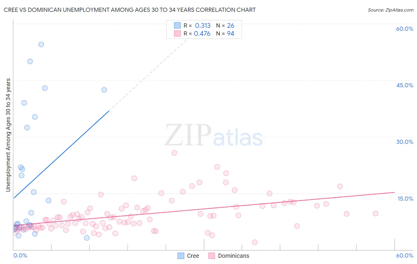 Cree vs Dominican Unemployment Among Ages 30 to 34 years Correlation Chart