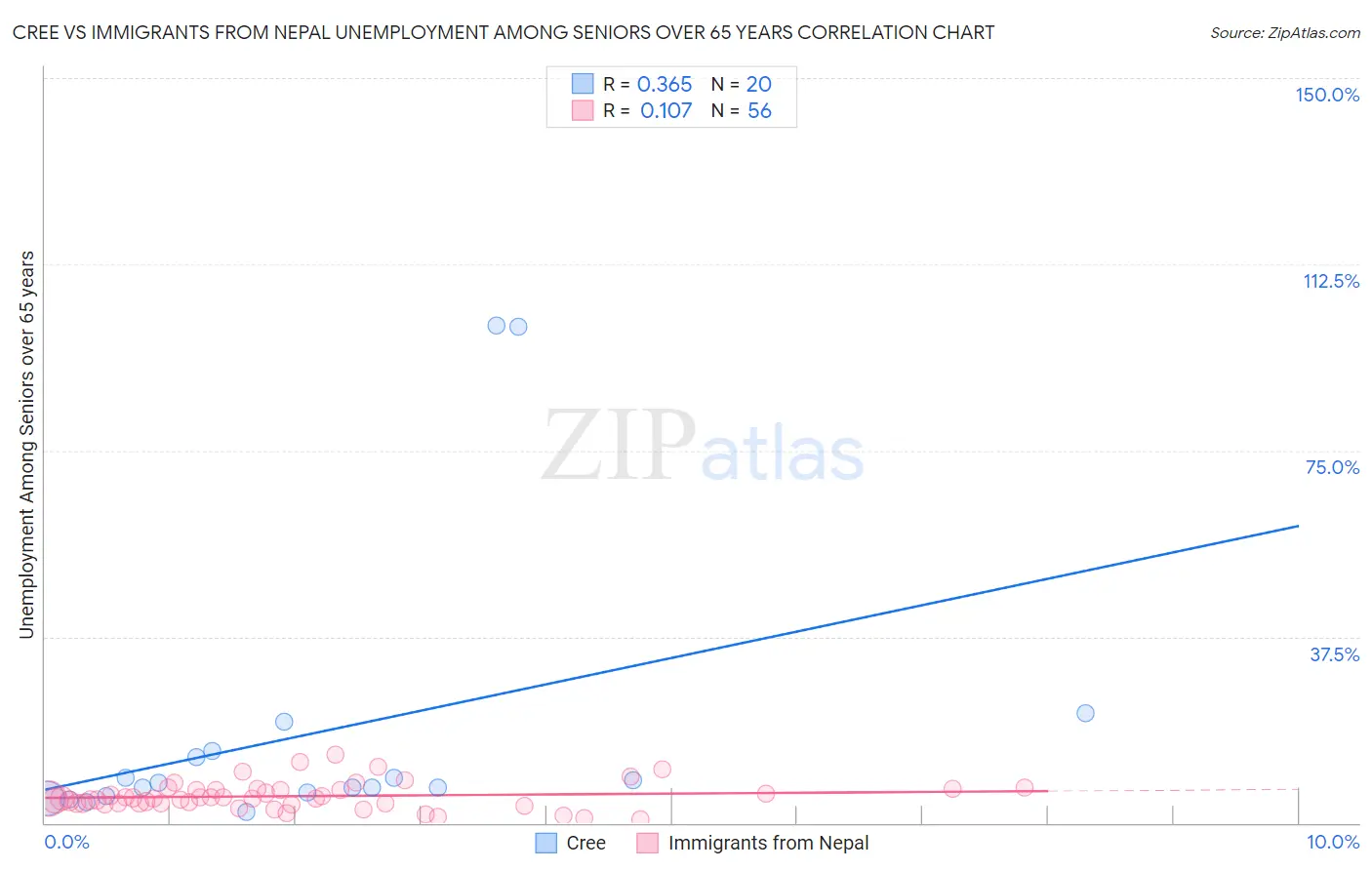 Cree vs Immigrants from Nepal Unemployment Among Seniors over 65 years Correlation Chart