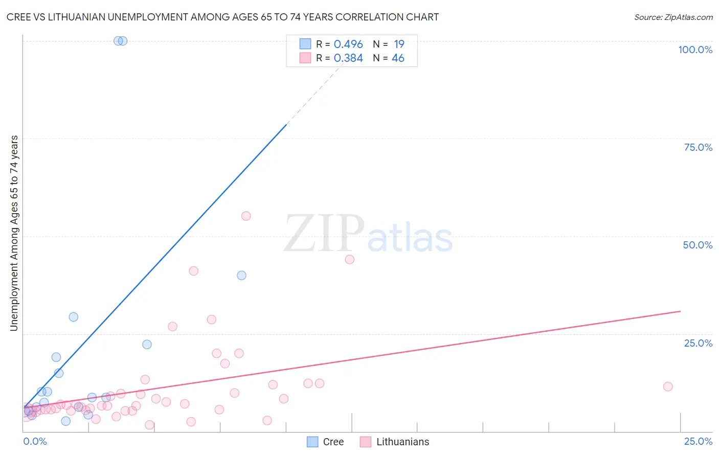 Cree vs Lithuanian Unemployment Among Ages 65 to 74 years Correlation Chart