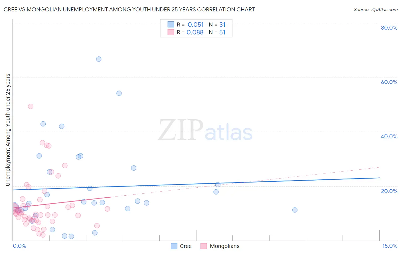 The statistical analysis conducted on geographies consisting of 75,921,108 people shows a slight positive correlation between the proportion of Cree and unemployment rate among youth under the age of 25 in the United States with a correlation coefficient (R) of 0.051 and weighted average of 12.4%. Similarly, the statistical analysis conducted on geographies consisting of 140,041,883 people shows a slight positive correlation between the proportion of Mongolians and unemployment rate among youth under the age of 25 in the United States with a correlation coefficient (R) of 0.088 and weighted average of 11.1%, a difference of 12.4%.