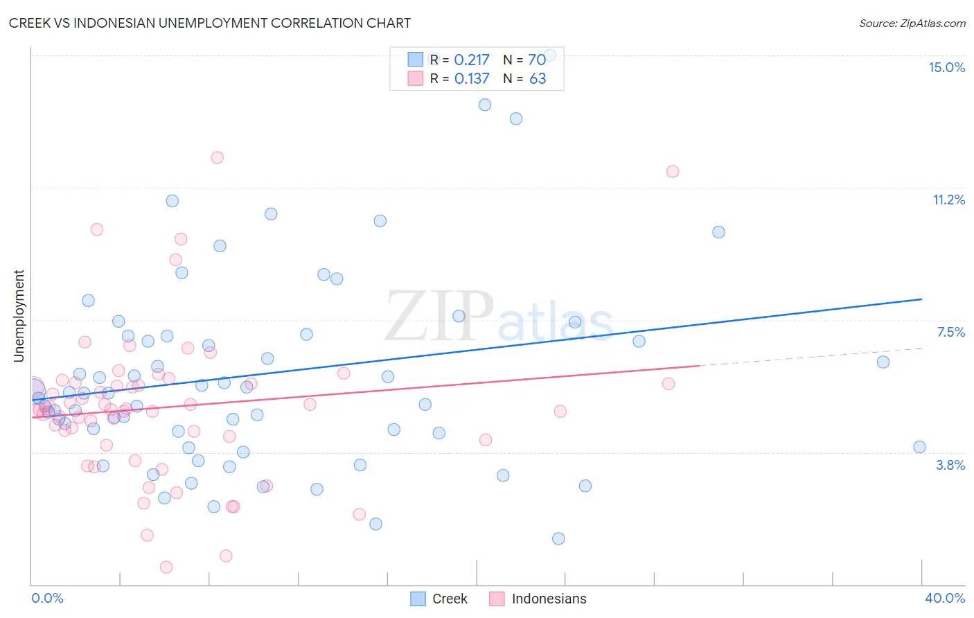 The statistical analysis conducted on geographies consisting of 178,280,208 people shows a weak positive correlation between the proportion of Creek and unemployment in the United States with a correlation coefficient (R) of 0.217 and weighted average of 5.4%. Similarly, the statistical analysis conducted on geographies consisting of 162,697,031 people shows a poor positive correlation between the proportion of Indonesians and unemployment in the United States with a correlation coefficient (R) of 0.137 and weighted average of 5.1%, a difference of 4.7%.