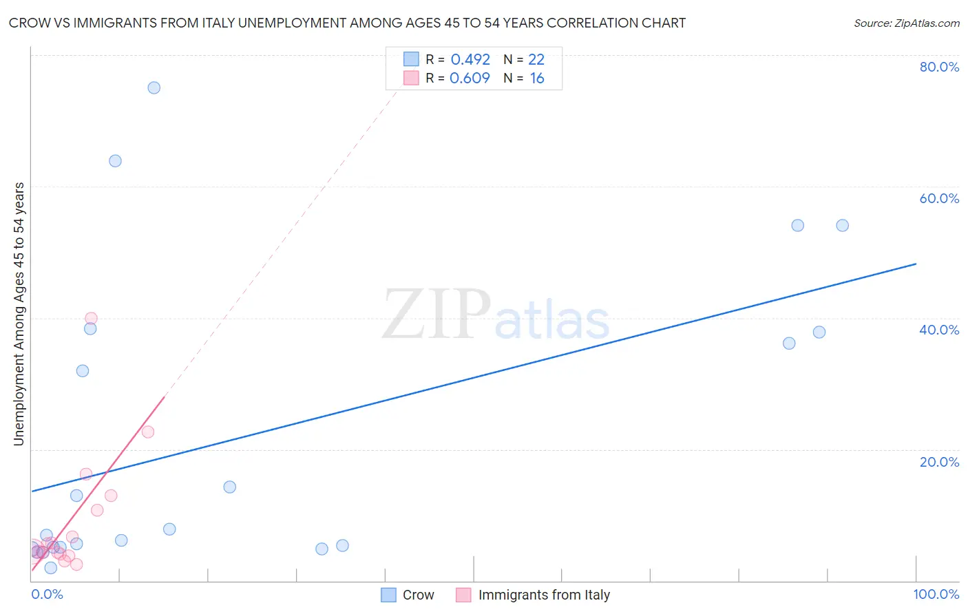 Crow vs Immigrants from Italy Unemployment Among Ages 45 to 54 years Correlation Chart