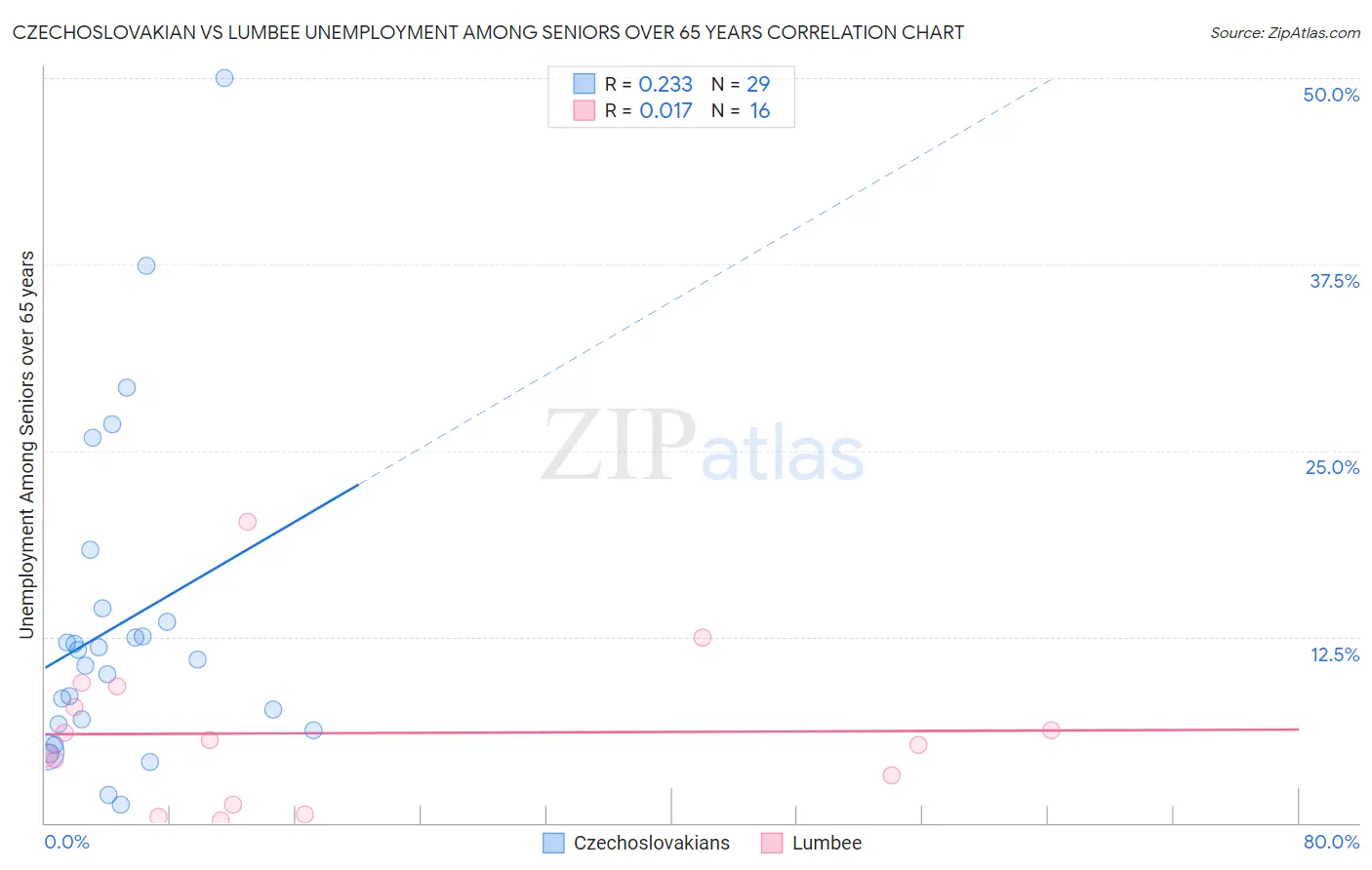 Czechoslovakian vs Lumbee Unemployment Among Seniors over 65 years Correlation Chart