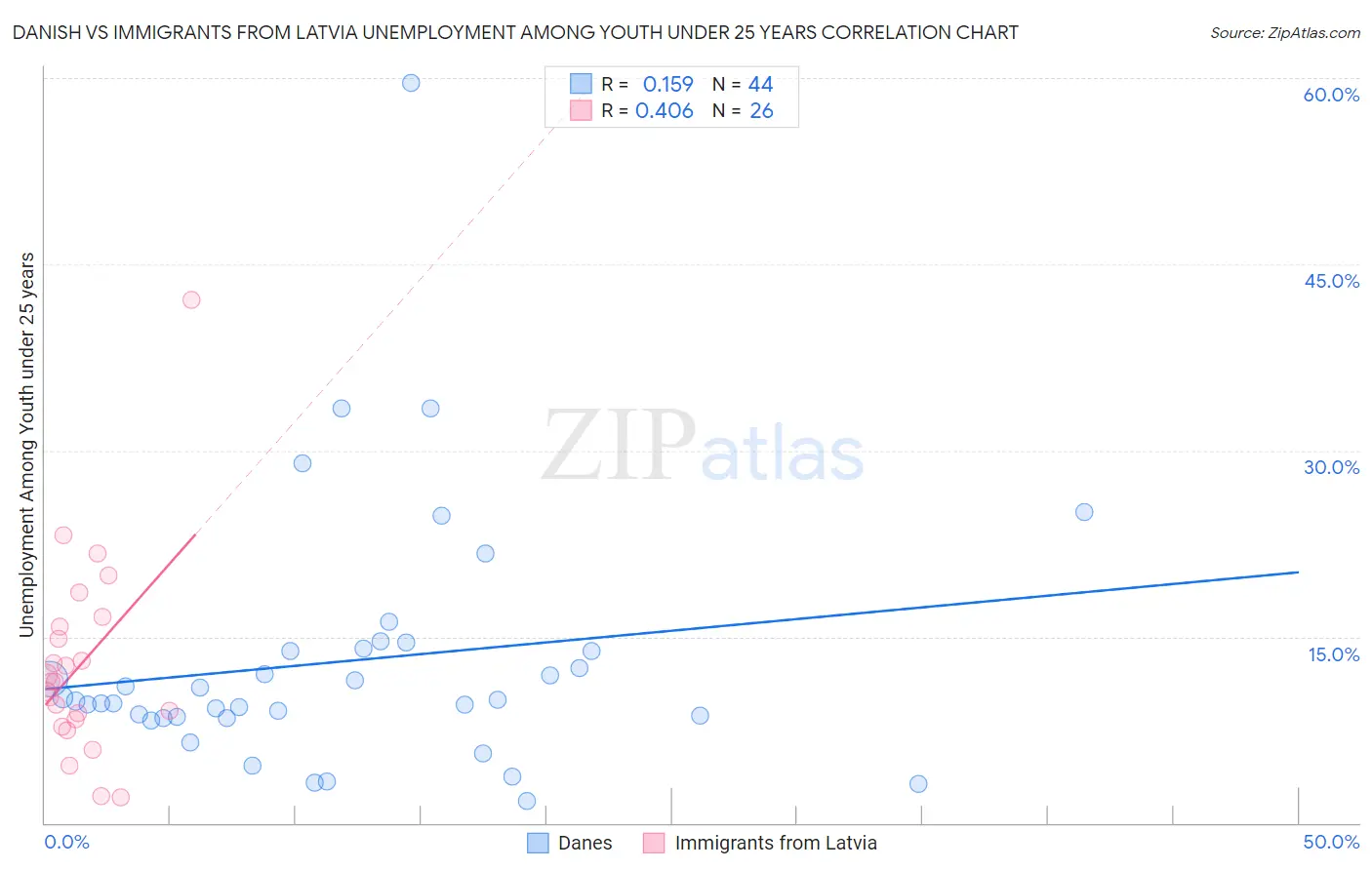 Danish vs Immigrants from Latvia Unemployment Among Youth under 25 years Correlation Chart