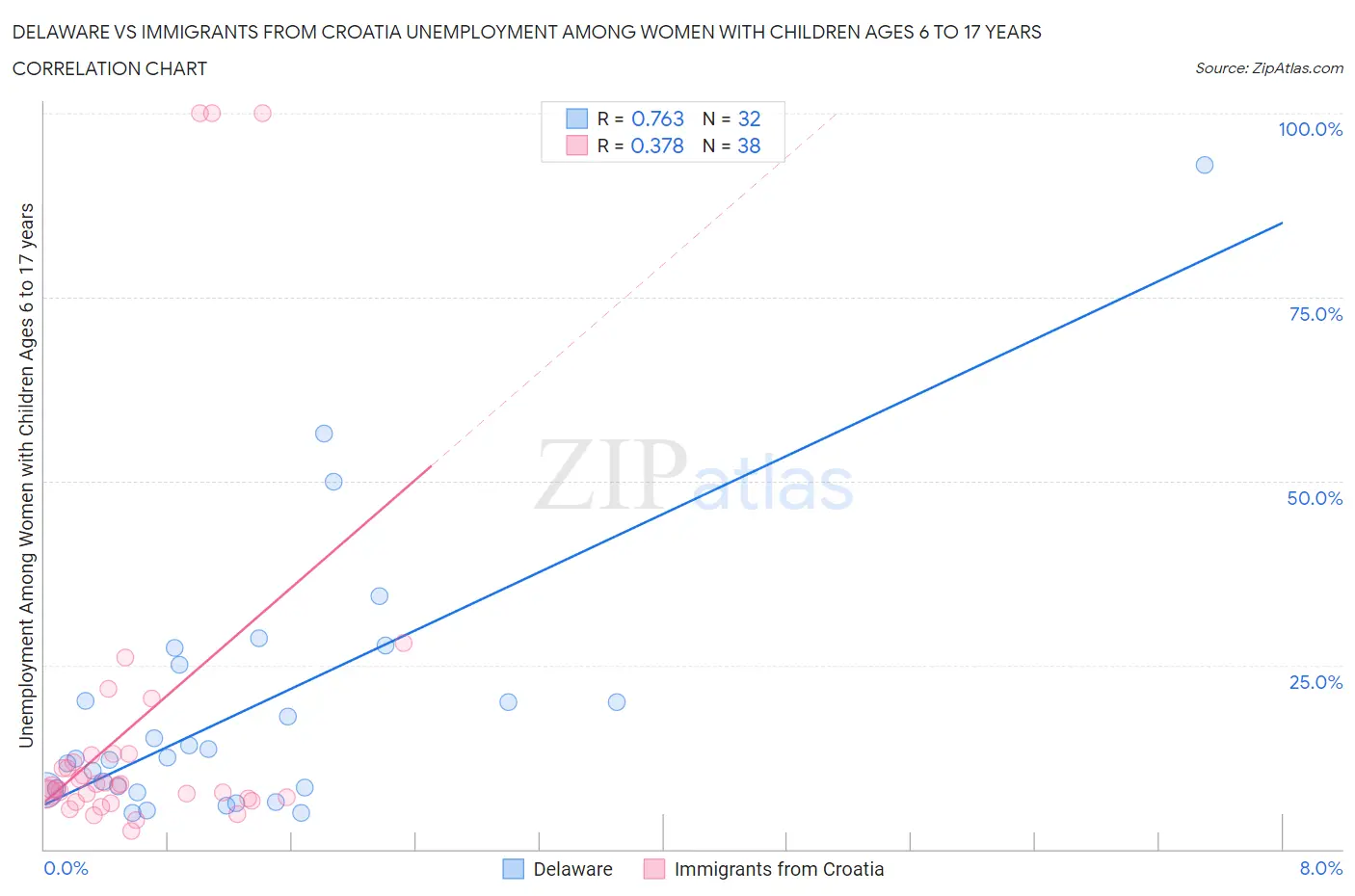 Delaware vs Immigrants from Croatia Unemployment Among Women with Children Ages 6 to 17 years Correlation Chart