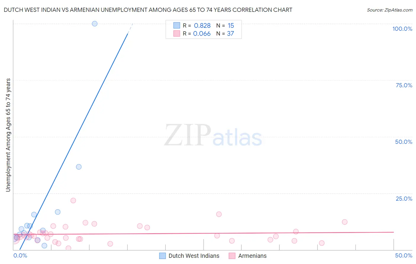 Dutch West Indian vs Armenian Unemployment Among Ages 65 to 74 years Correlation Chart