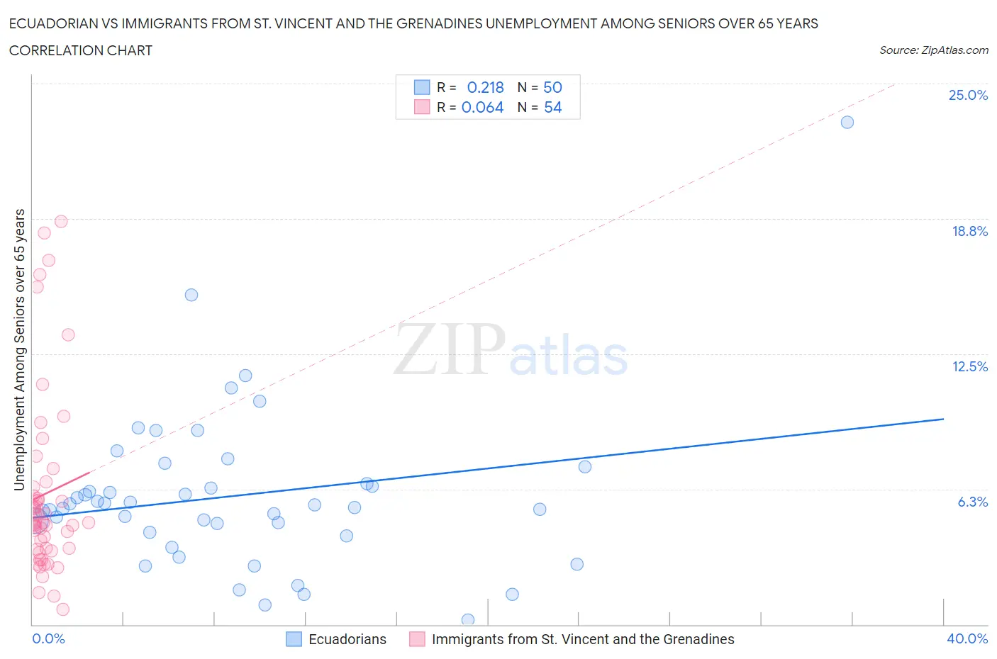 Ecuadorian vs Immigrants from St. Vincent and the Grenadines Unemployment Among Seniors over 65 years Correlation Chart