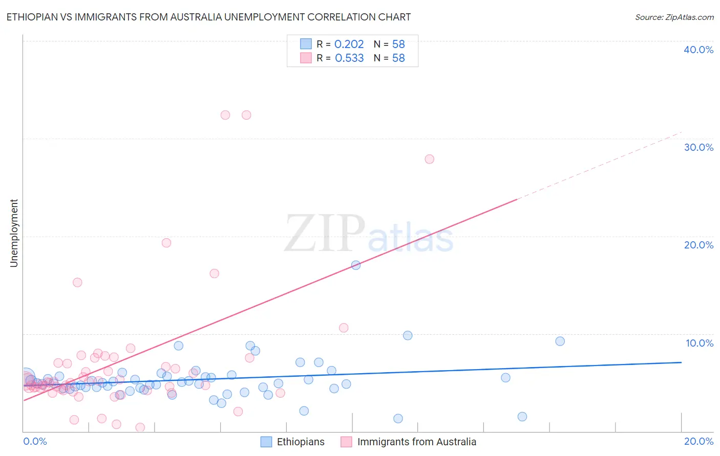 Ethiopian vs Immigrants from Australia Unemployment Correlation Chart