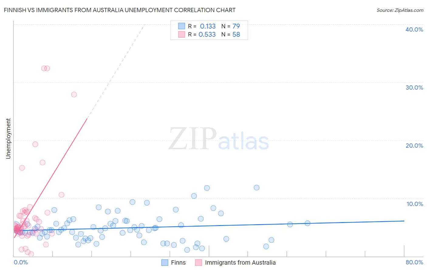 Finnish vs Immigrants from Australia Unemployment Correlation Chart