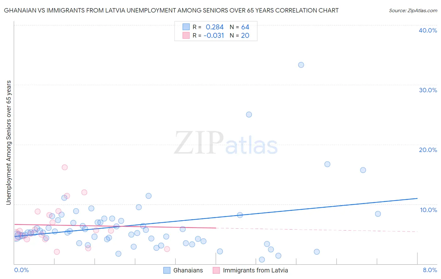 Ghanaian vs Immigrants from Latvia Unemployment Among Seniors over 65 years Correlation Chart