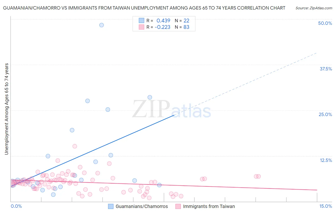 Guamanian/Chamorro vs Immigrants from Taiwan Unemployment Among Ages 65 to 74 years Correlation Chart