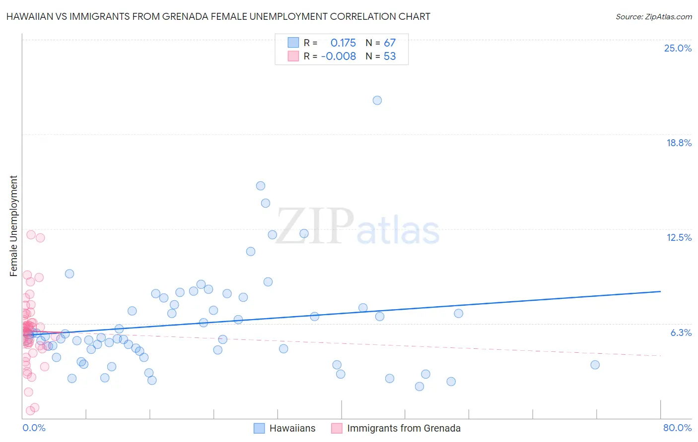 Hawaiian vs Immigrants from Grenada Female Unemployment Correlation Chart