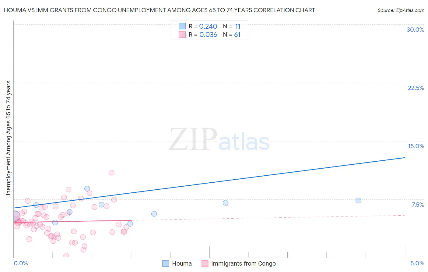 Houma vs Immigrants from Congo Unemployment Among Ages 65 to 74 years Correlation Chart
