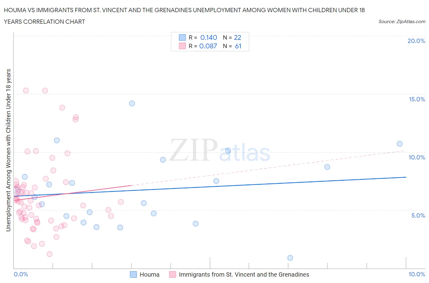 Houma vs Immigrants from St. Vincent and the Grenadines Unemployment Among Women with Children Under 18 years Correlation Chart