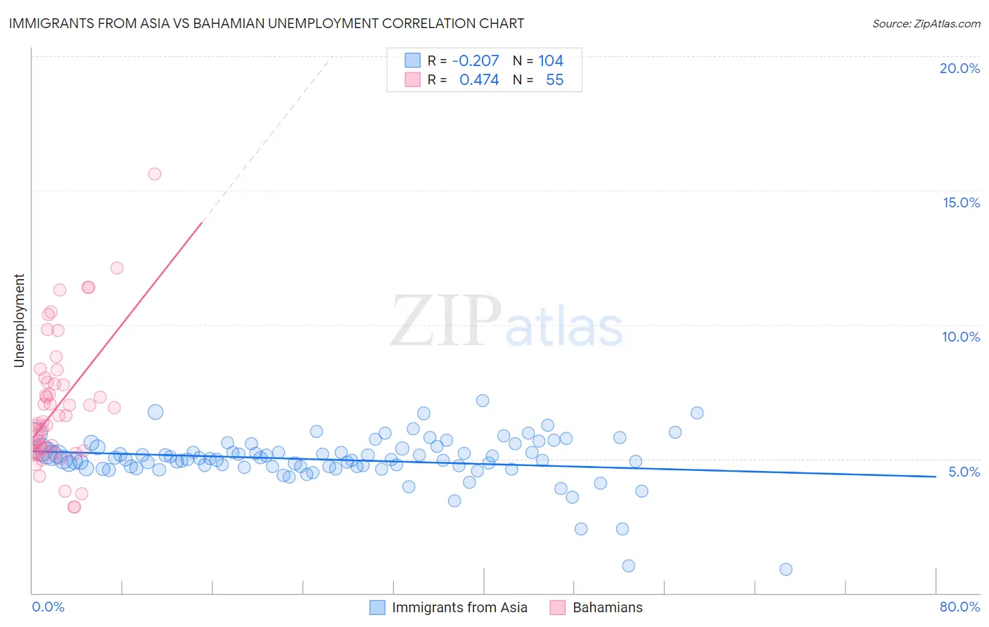 The statistical analysis conducted on geographies consisting of 547,060,579 people shows a weak negative correlation between the proportion of Immigrants from Asia and unemployment in the United States with a correlation coefficient (R) of -0.207 and weighted average of 5.1%. Similarly, the statistical analysis conducted on geographies consisting of 112,657,665 people shows a moderate positive correlation between the proportion of Bahamians and unemployment in the United States with a correlation coefficient (R) of 0.474 and weighted average of 5.9%, a difference of 15.4%.