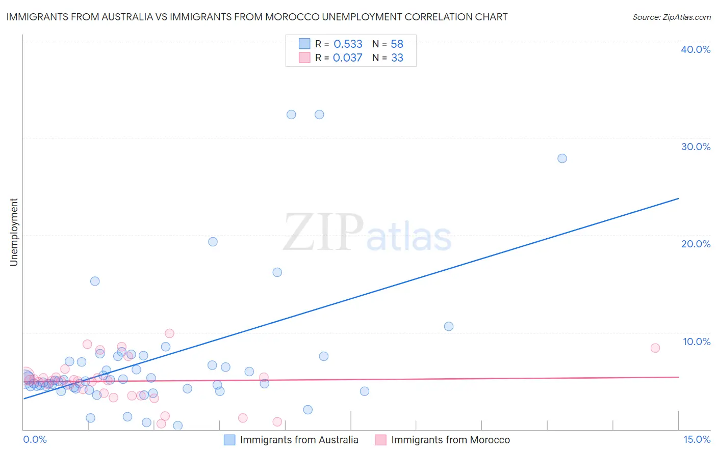 Immigrants from Australia vs Immigrants from Morocco Unemployment Correlation Chart