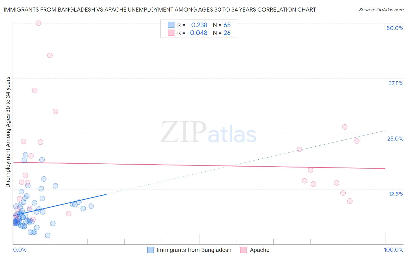 Immigrants from Bangladesh vs Apache Unemployment Among Ages 30 to 34 years Correlation Chart